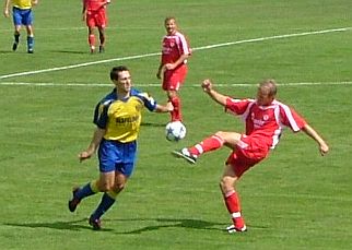 Zugegeben, die Löwen kamen schleppend in ihren Rhytmus und es wollte zunächst nicht recht laufen. "Rund" lief es auch nicht bei Mirko Dickhaut, der trotz seiner Fersensporn-Verletzung den Einsatz wagte, sich mehr schlecht als recht mühte und dann in der Halbzeit-Pause "kapitulierte". Für den 34jährigen KSV-Rückkehrer und -Hoffnungsträger kam Goce Malinov, der einen gelungenen Oberliga-Einstand im Löwen-Dress gab. Bemerkenswert am Rande, dass Mirko Dickhaut, der wie alle Akteure des "Löwen-Teams 2005/2006" Wert auf Kontaktpflege mit den Fans legt, die zweite Halbzeit im "KSV-Anhänger-Block" verbrachte.