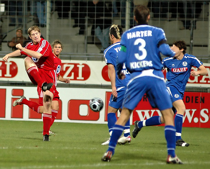 Doch Kassels Nr. 10 sollte alsbald noch seine "Abstauber- Qualitäten" unter Beweis stellen. Zuvor brachte Oliver Stierle mit einem fulminanten Linksschuß von halblinker Position die Gastgeber auf 1:2 heran, wobei KSV- Keeper Oliver Adler den Ball vor Überqueren der Torlinie im Eck noch mit den Fingerspitzen berührt hatte (33.). Pech für Kassels großartigen Rückhalt, der zuvor per Reflex bzw. Fußabwehr bereits eine Großchance von Mesic vereitelt hatte.