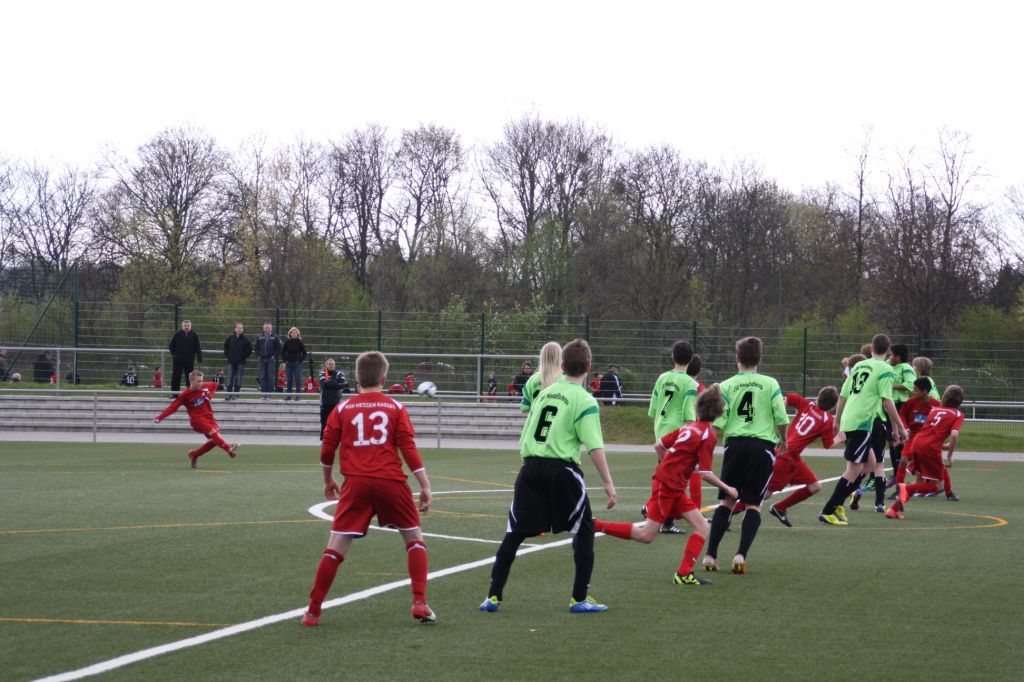 Da das Spiel knapp 10 Minuten früher als geplant angepfiffen wurde, verpaßte der Verfasser dieser Zeilen den Paukenschlag zu Beginn des Matches, freute sich aber mit dem Löwen-Anhang über das frühe 1:0 durch Alessandro in der 2. Spielminute. Überhaupt war der Spielfluß unserer Kicker außerordentlich erquickend. Das Tempo wurde bestimmt und in der Regel hoch gehalten. Die „Wundertüte U14“ zeigte endlich wieder ihr wahres Gesicht. So erspielte man sich reichlich Torchancen und muß eigentlich nur die mangelnde Torausbeute beklagen. Glücklicherweise gelang dann aber Mert noch mit dem Pausenpfiff das 2:0, als sein Schuß aus mittlerer Distanz abgefälscht im Netz landete. Zu diesem Zeitpunkt hätte es schon ohne weiteres 4 oder 5 zu 0 stehen können (Pfosten, Latte und Torhüter standen jeweils im Weg).