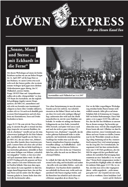 „Sonne, Mond und Sterne … mit Eckhardt in die Ferne“. Mit diesem Werbeslogan auf einem der beiden Reisebusse machen wir uns am frühen Morgen des 14. April 2007 auf die lange Reise an den Bodensee, wo unsere Löwen zwar noch nicht nach den Sternen greifen, aber zu einem immens wichtigen Spiel gegen einen direkten Mitkonkurrenten gegen Abstieg, den SC