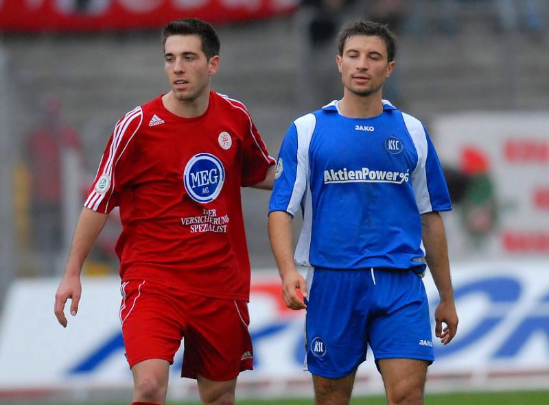 Ole Schröder (Kapitän Karlsruher SC II) (L) im Zweikampf mit Thorsten Bauer (KSV Hessen Kassel)