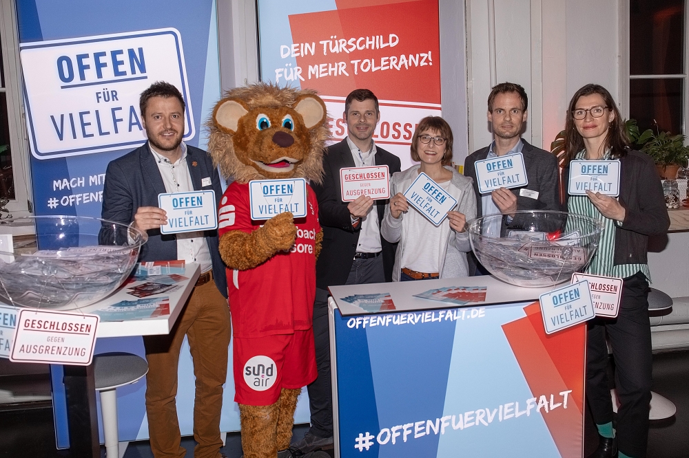 Neujahrsempfang 2019: Michael Krannich, Maskottchen Totti, Daniel Bettermann, Dagmar KrauĂźe (Wintershall, Offen fĂĽr Vielfalt), Enrico Gaede, Madlen Freudenberg (Neue Denkerei)