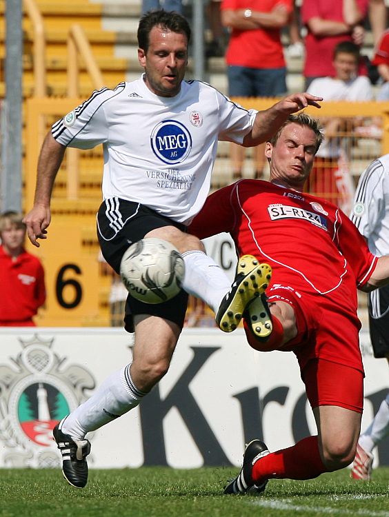 Hoch das Bein von Mario Klinger gegen Robert Vujevic (re.)