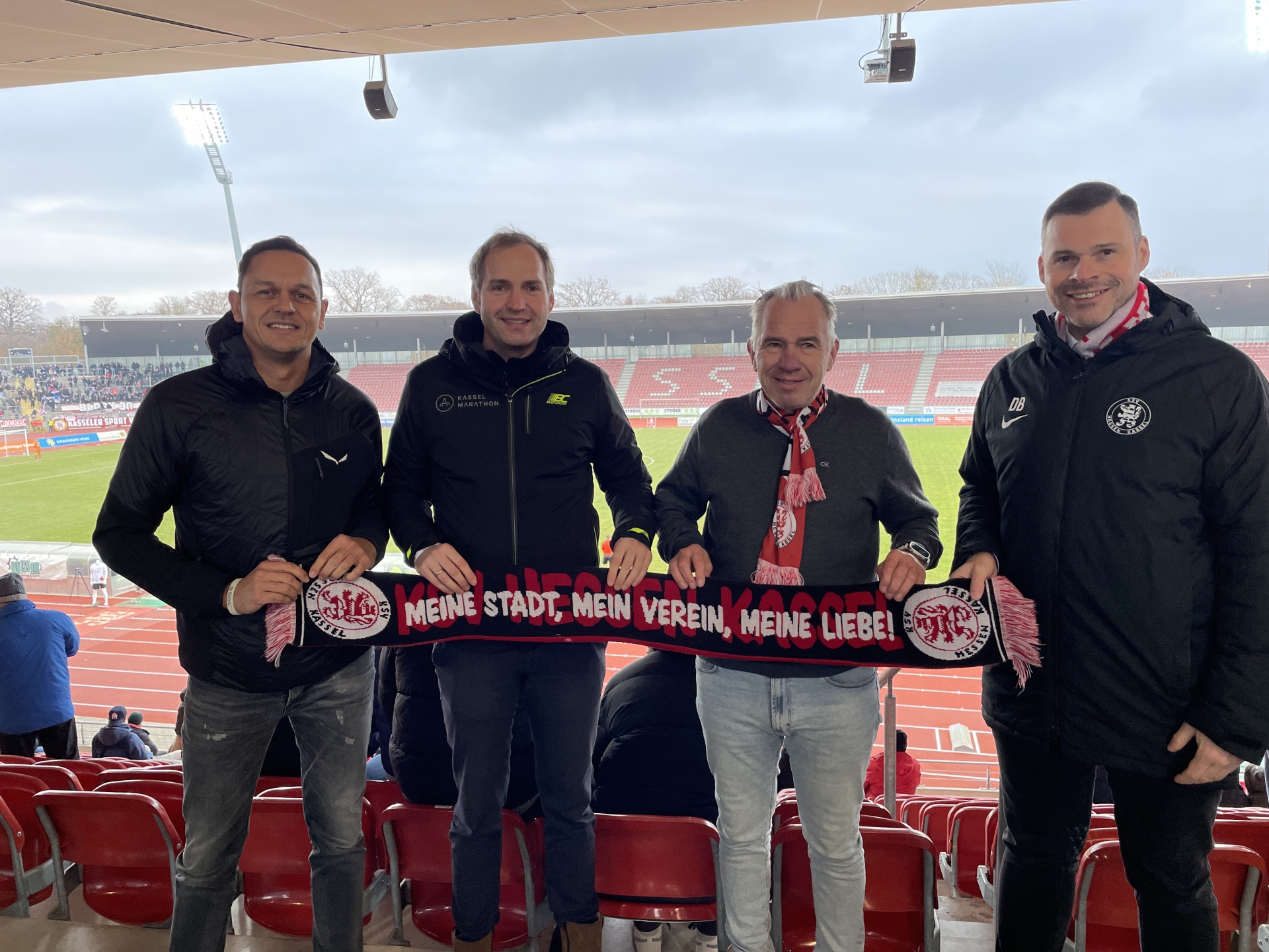 Michael Aufenanger (zweiter von links) vom Kassel Marathon sowie die KSV-VorstÀnde (v.l.) Swen Meier, Jens Rose und Daniel Bettermann: Die Sportfamilie hÀlt zusammen. Der Kassel Marathon unterst tzt die Löwen beim Anfeuern im Auestadion. Auch im kommend