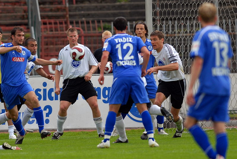 Kopfballduell zwischen Thorsten Schönewolf und Sokol Kacani (rechts)