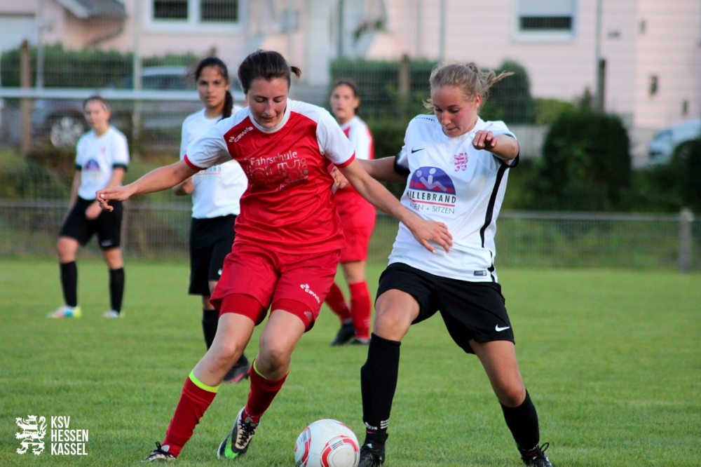 Unsere Frauen begannen gleich sehr gut. Sie stellten die Laufwege der Gastgeberinnen zu und waren sehr präsent in den Zweikämpfen. So erspielten sie sich auch gleich zu Beginn der Partie ein paar gute Chancen. Meist gelang der Ball über die Mitte durch einen langen Diagonalball nach außen, wo er dann in die Mitte geschlagen wurde. Die gute Abwehr der Klein-Lindenerinnen verhinderte jedoch das Tor für unseren KSV. Nach gut 25 Minuten ließen unsere Löwinnen dann aber leider ein wenig nach und das nutzen die Platzdamen schonungslos aus. Nun war die Kasseler Defensive gefragt und hielt auch bis zur 38. Spielminute stand. Dann passierte allerdings in der Vorwärtsbewegung ein individueller Fehler und die Löwinnen liefen in einen Konter. Daniela Fondacaro nutze diese Unachtsamkeit aus und erzielte das 1:0.