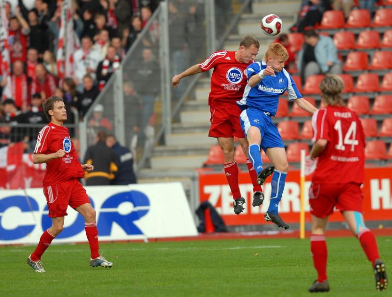 Luftkampf zwischen Dominik Suslik (KSV Hessen Kassel) und Mathias Fetsch (Karlsruher SC II)