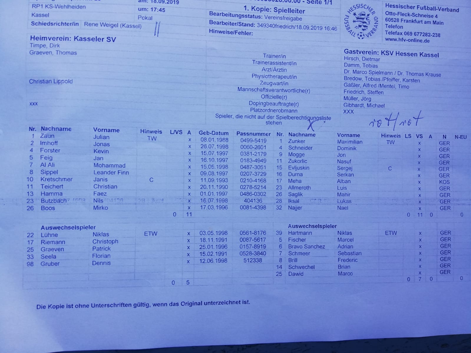 Kasseler SV, KSV Hessen Kassel, Aufstellungen