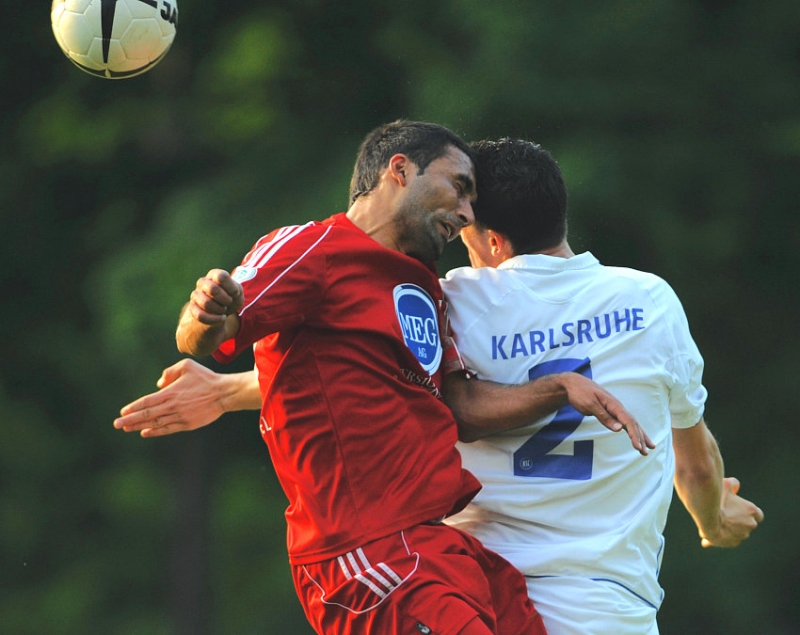 Kopfballduell von Turgay Gölbasi (KSV Hessen Kassel) gegen Stefan Müller (KSC II)