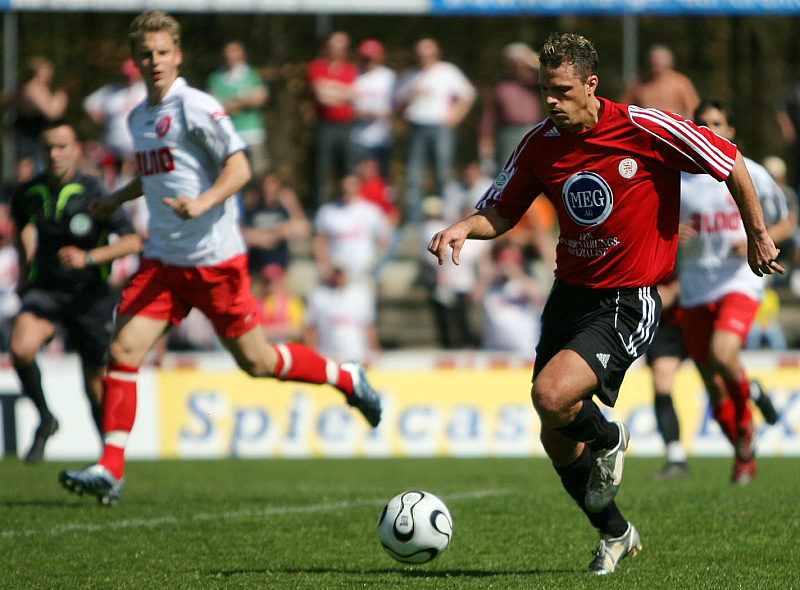Der 1:0 Torschütze Jan Fießer gegen Mark Zeh (links)