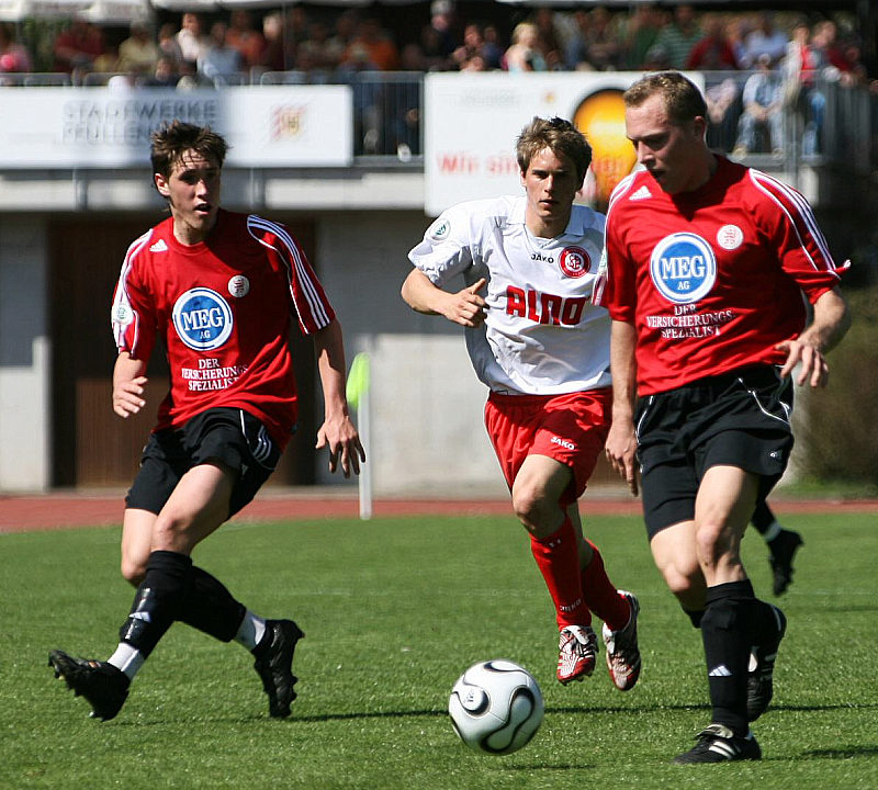 Kampf um den Ball von Denis Berger (Mitte) und Christian Deufel (li.), Fabian Gerster (re.)