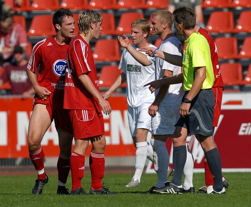 Michael Kümmerle (KSV Hessen Kassel) diskutiert mit SR Wolfgang Walz nach einem Faulspiel