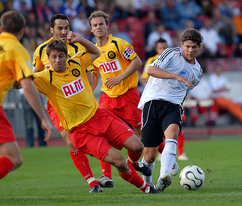 Mario Klinger gegen vier Pfullendorfer Spieler (Foto: Sippel)