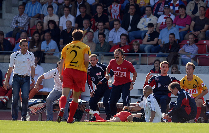 Aufregung vor der Pfullendorfer Trainerbank über Zweikampfeinsatz von Julio Cesar (Foto: Sippel)