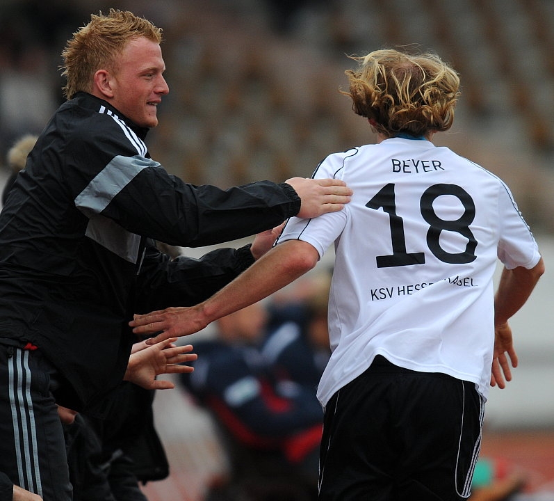 Der Torschütze Daniel Beyer mit Dennis Lamczyk (Torwart KSV Hessen Kassel)