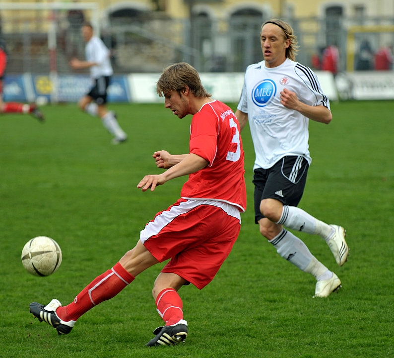 Zweikampf zwischen Tobias Zellner (SSV Jahn) (L) und Denis Berger (KSV Hessen)