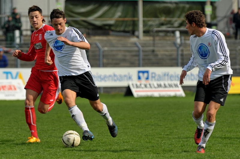 Michael Kümmerle (KSV Hessen Kassel) (R) gegen Sebastian Escherich und Andreas Schäffer (SSV Jahn)