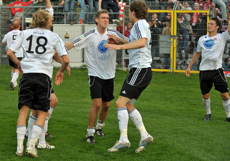 Andreas Haas (KSV Hessen Kassel) (M) bejubelt den Treffer zum 0:1