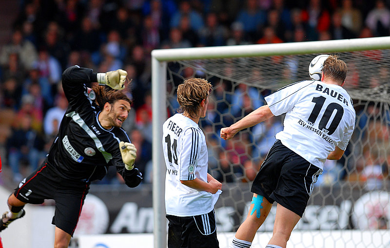 Thorsten Bauer per Kopfball zum 1:0, vorbei an Siegens Torwart Thomas Richter (li.) (Foto: Roland Sippel)