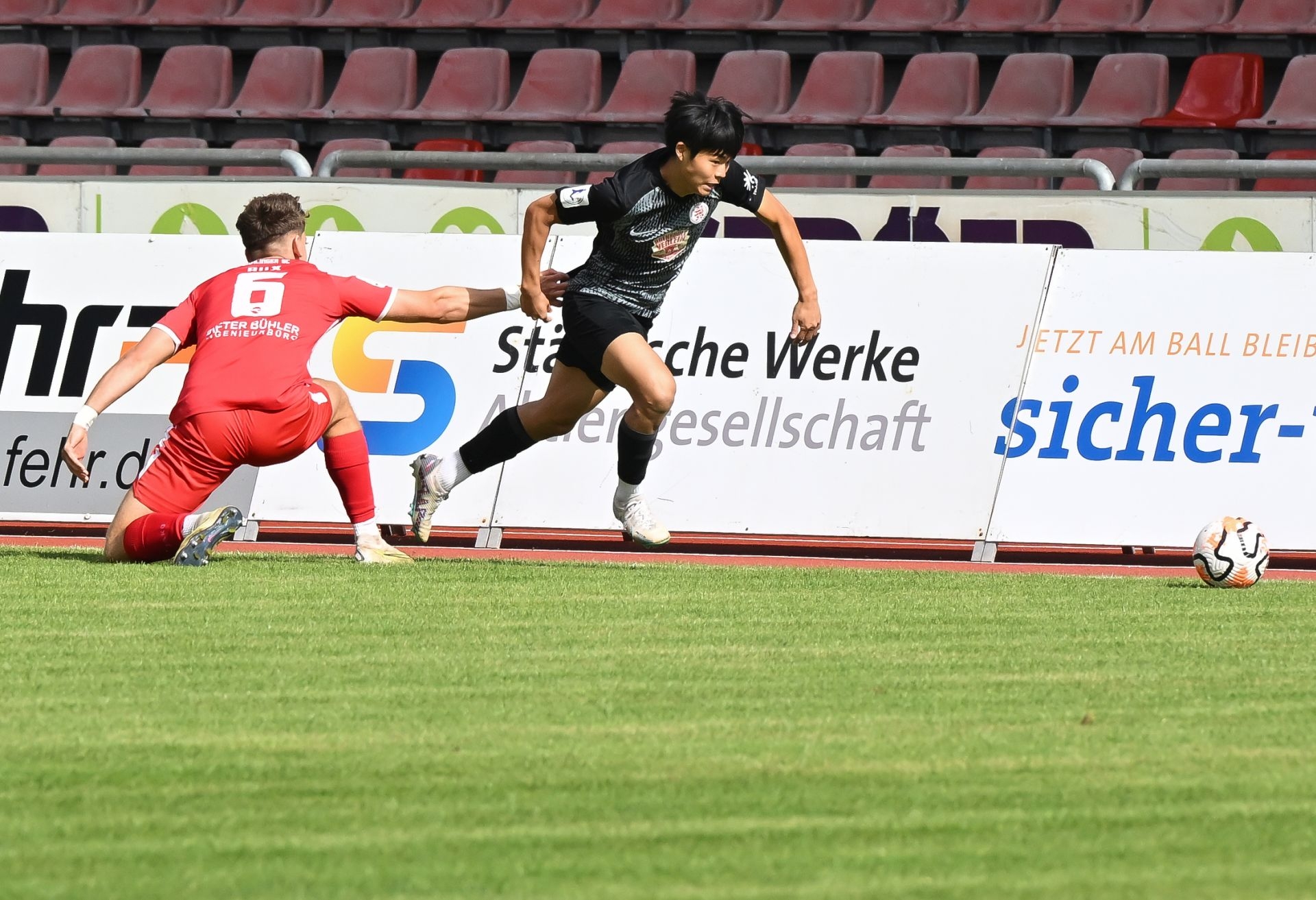 Aaron versucht von links einen Ball in die Box zu schlagen, aber dieser rutscht ĂŒber den Spann und es gibt aus Löwensicht nur Torab fĂŒr Mainz.