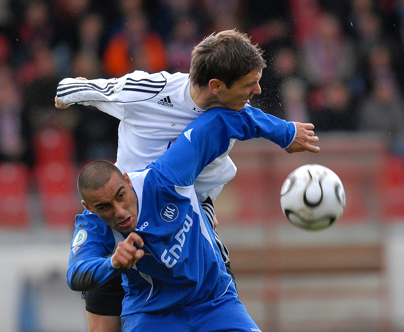 Kopfballduell zwischen Thorsten Schönewolf (oben) und Halut Türkeri