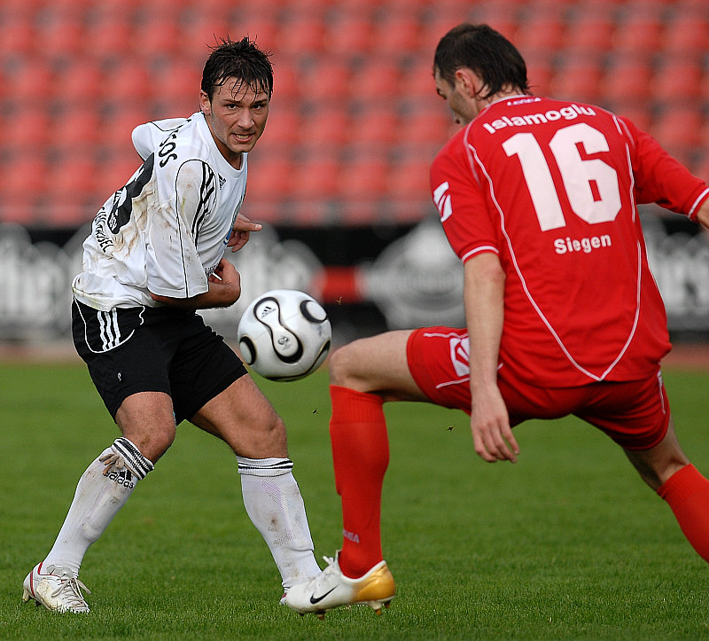 Thorsten Bauer per Kopfball zum 1:0, vorbei an Siegens Torwart Thomas Richter (li.) (Foto: Roland Sippel)