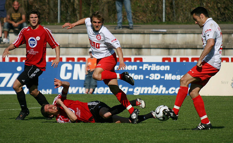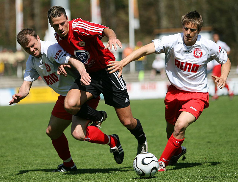 Kampf um den Ball von Denis Berger (Mitte) und Christian Deufel (li.), Fabian Gerster (re.)