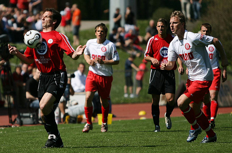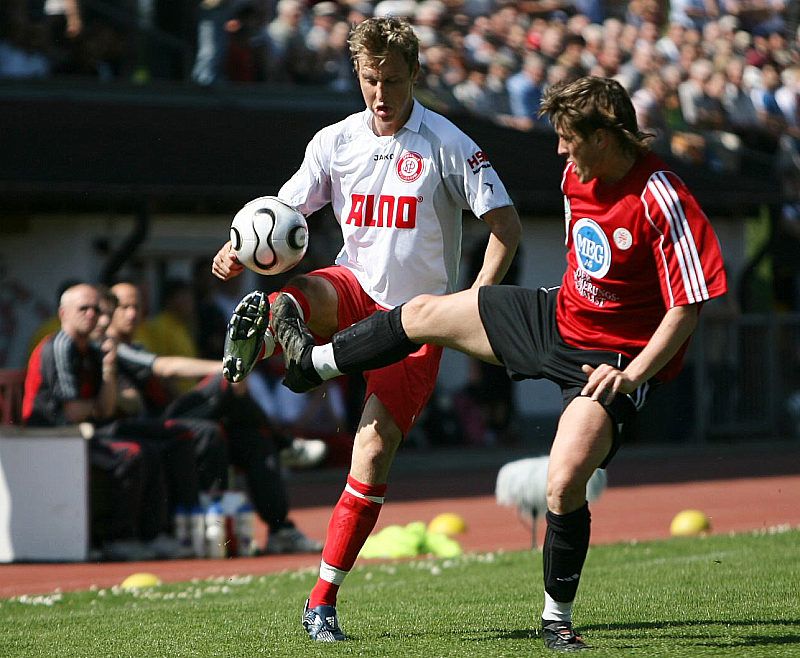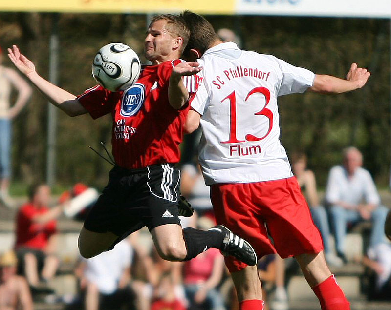 Im Luftkampf Marc Arnold am Ball gegen Johannes Flum (rechts)