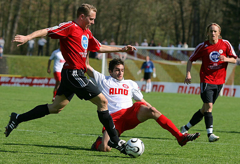 Mario Klinger (links) Ivica Lucic (mitte), Neno Rogosic (re.) und Torschütze zum 2:1 Thorsten Schönewolf am Boden