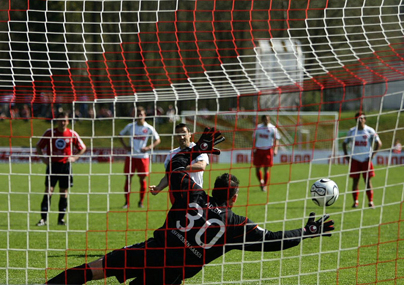 Neno Rogosic schießt den Elfmeter links an Oliver Adler vorbei in die Maschen zum 1:1