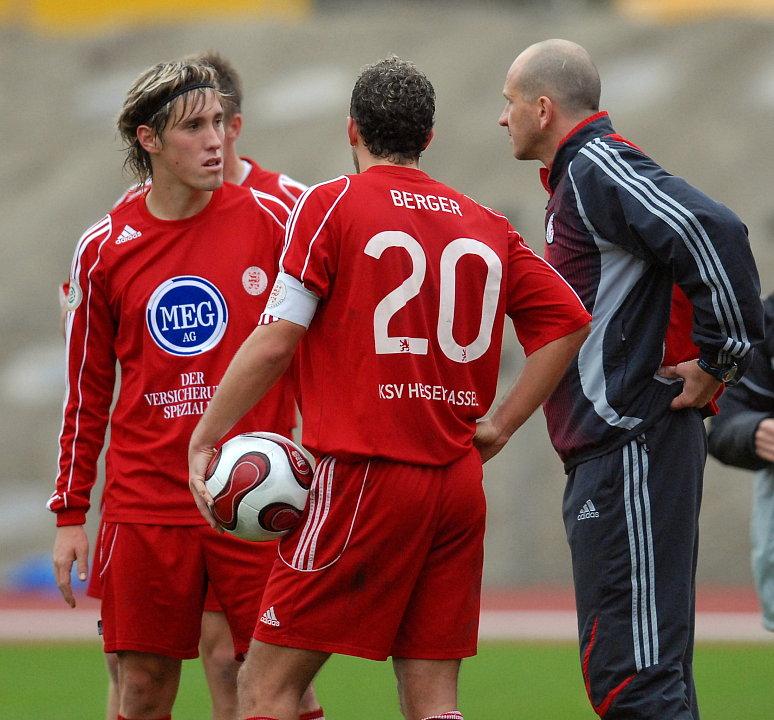 Jan Fießer (L) und Denis Berger lauschen den Anweisungen von Matthias Hamann (Trainer KSV Hessen Kassel )