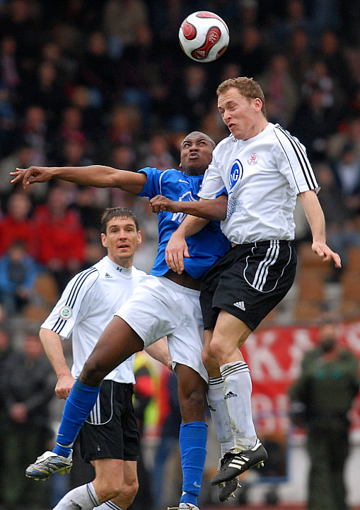 Thorsten Schönewolf (hinten) beobachtet Kopfballduell von José Sebastiao da Veiga und Dominik Suslik (rechts)