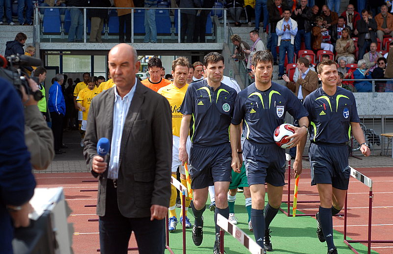 Werner Damm (HR) links, während dem Einlauf der Mannschaften, FIFA- Schiedsrichter Wolfgang Stark (Mitte) und die Assistenten Michael Emmer und Thomas Stein