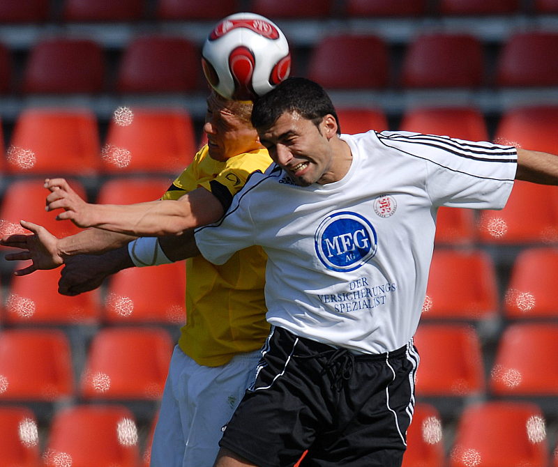 Kopfballduell von Turgay Gölbasi (rechts) gegen Mike Frantz
