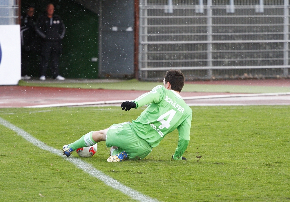 Sebastian Gundelach zu Recht stinksauer, weil der Linienrichter angezeigt hat, dass zuvor der Ball auf Wolfsburger Seite im Aus war, der Schiri aber auf weiterspielen entschieden hat und somit das erste Wolfsburger Tor ermöglicht hat...