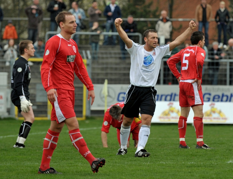 Andreas Haas (KSV Hessen Kassel) (M) bejubelt den Treffer zum 0:1