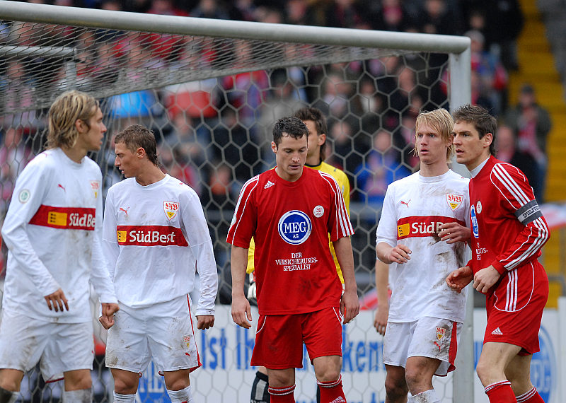 Konzentration im Strafraum vor einem Eckball Julian Schuster, Matthias Morys, Michael Kümmerle, Marco Pischorn und Thorsten Schönewolf (v. l.)