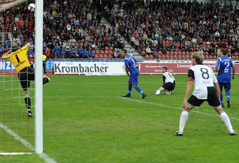 KSV Hessen - SC Pfullendorf: Schuss aufs Tor, Gaede im Vordergrund