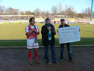 Fußballfest in Leipzig und 17.000 Euro fĂŒr Flutopfer Vor der stattlichen Kulisse von 4170 Zuschauern in Leipzig trennten sich Lok Leipzig und der KSV Hessen nach drei "Halbzeiten" im Benefizspiel fĂŒr die Flutopfer in SĂŒdostasien mit 6:2 fĂŒr die Löwen-Mannschaften.