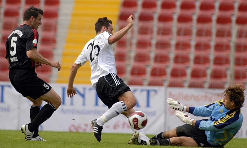 Michael Kümmerle (KSV Hessen Kassel) scheitert an FSV LU Torwart Assen Alexov (R)