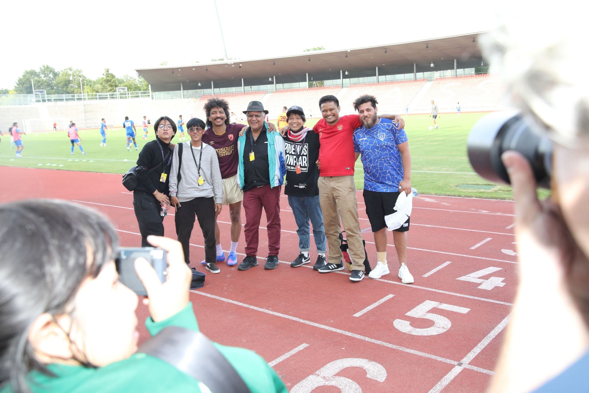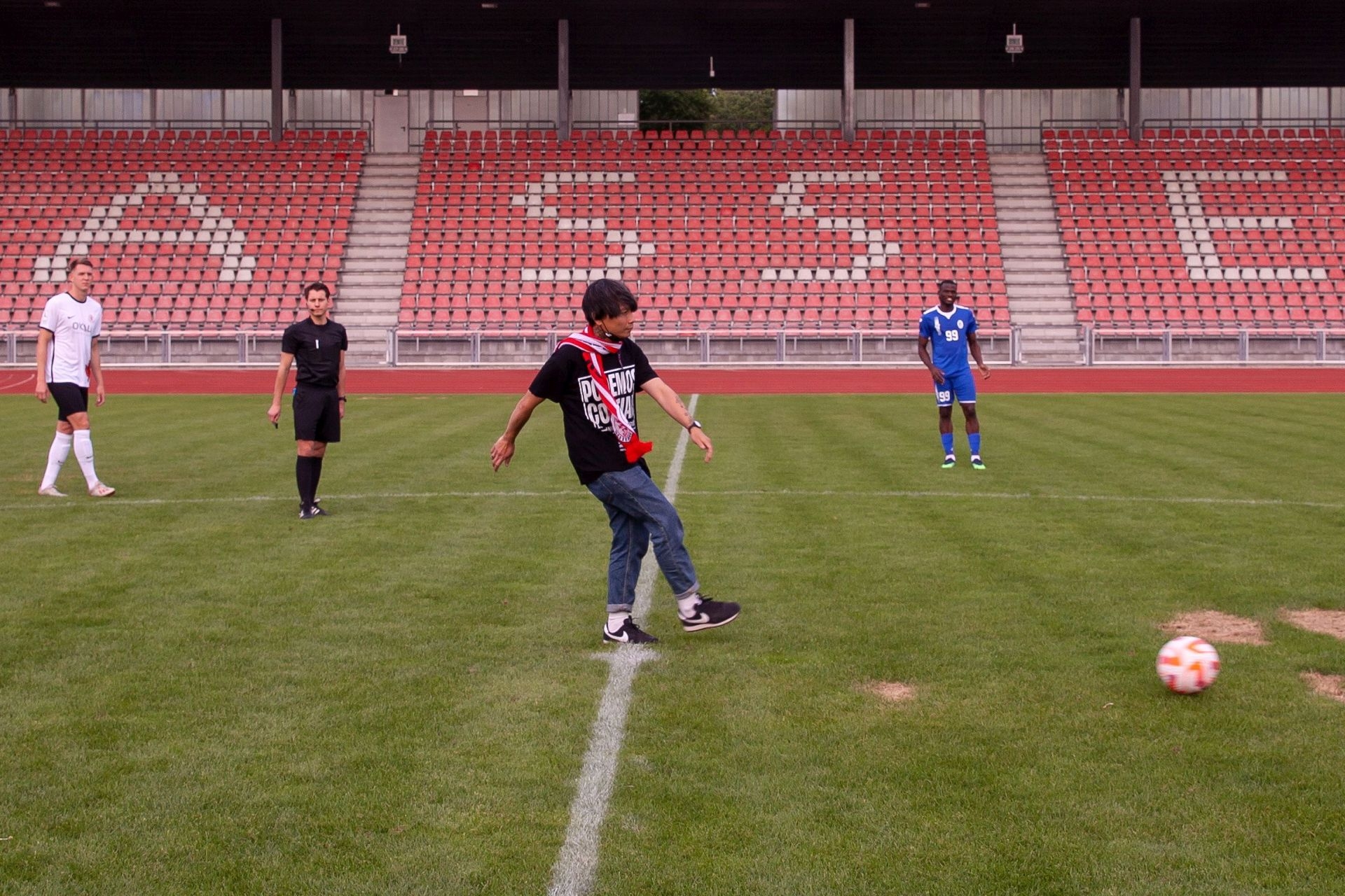 Freundschaftsspiel KSV Hessen - Hapoel Nir Ramat HaSharon: Reza Afisina (ruangrupa Kuratoren-Kollektiv documenta fifteen) führt den Anstoß aus und spielt den Ball zu Hapoel Nir Ramat HaSharon