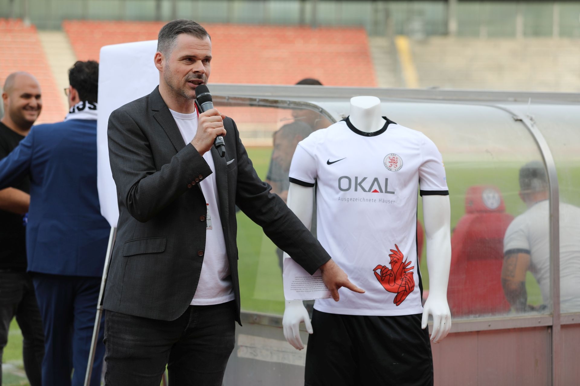 Freundschaftsspiel KSV Hessen - Hapoel Nir Ramat HaSharon: Daniel Bettermann präsentiert das neue Trikot mit documenta fifteen Bezug