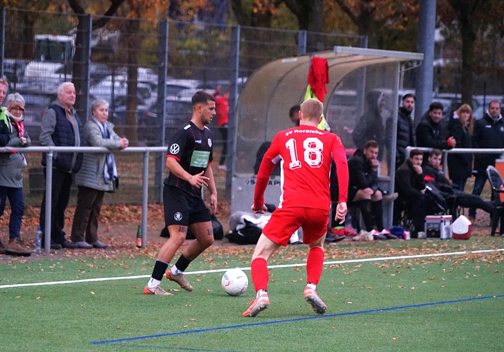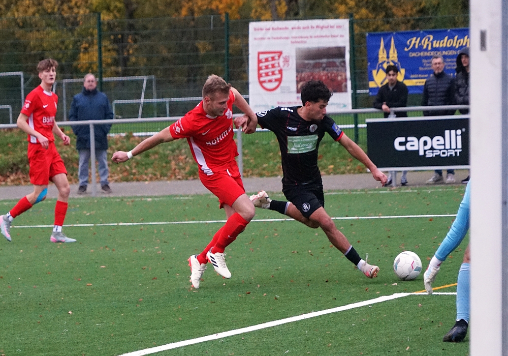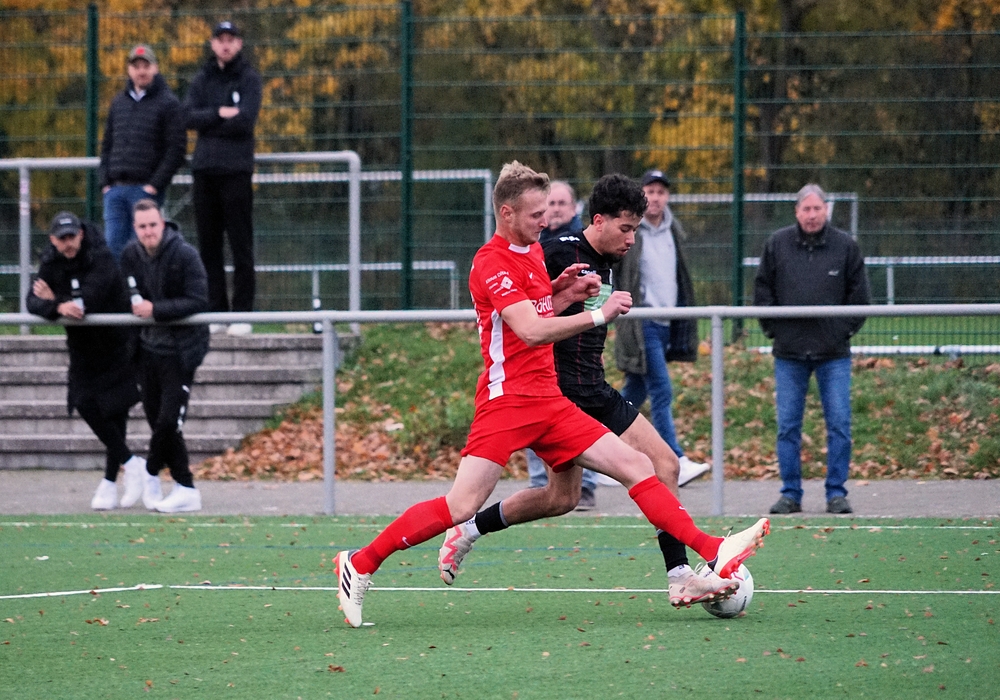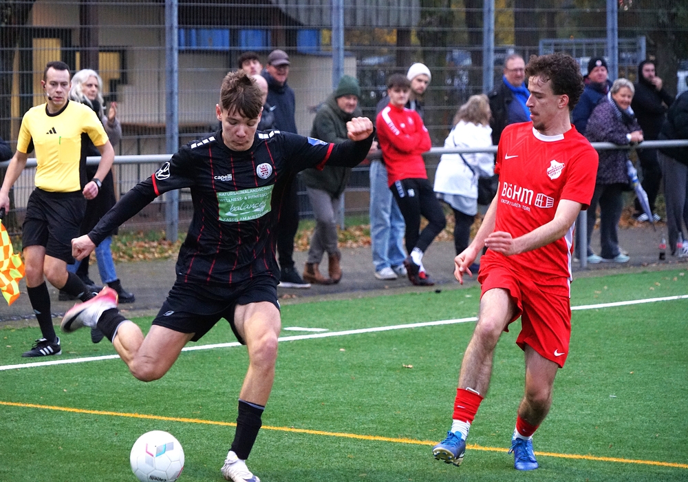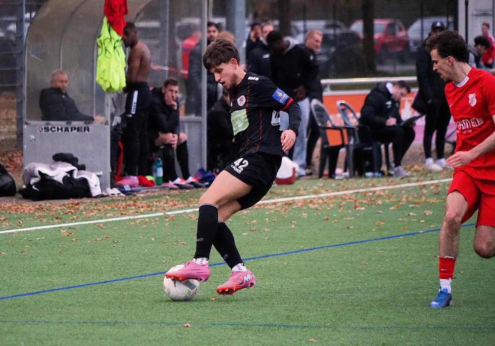 Guter Pass auf Adrian in die Spitze. Er macht noch einen Haken und verheddert sich dabei. Aktion verpufft.