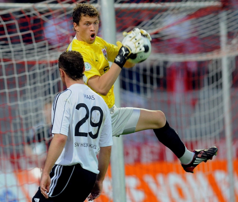 Andreas Haas (KSV Hessen Kassel) scheitert an Timo Hammel (Torwart VFB Stuttgart II)
