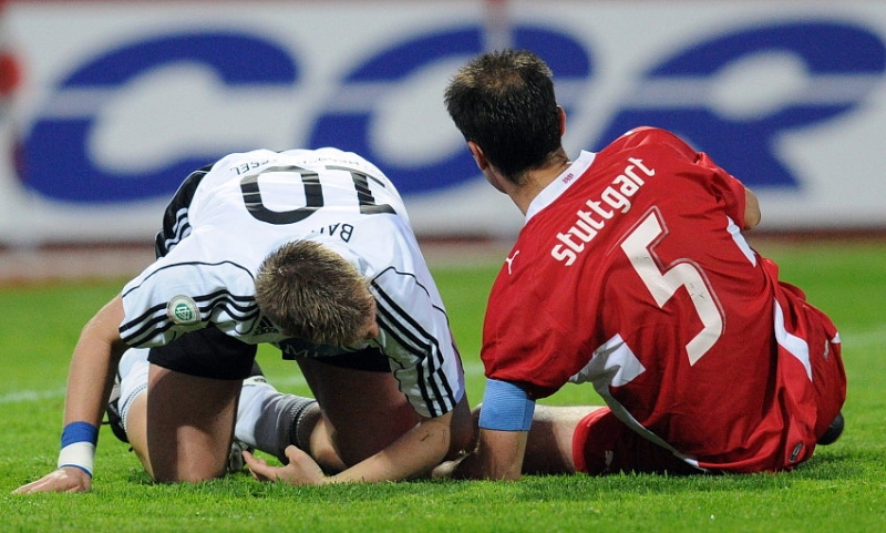 Thorsten Bauer (KSV Hessen Kassel) und Marijan Kovacevic (VFB Stuttgart II) nach Zweikampf am Boden