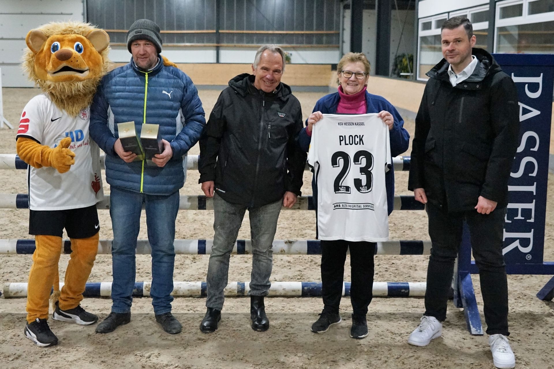 Neuzugang Sercan Sararer zusammen mit KSV-Vorstand Jens Rose und Frank Plock auf dem Pferd beim Neujahrsempfang in der Reithalle Borken